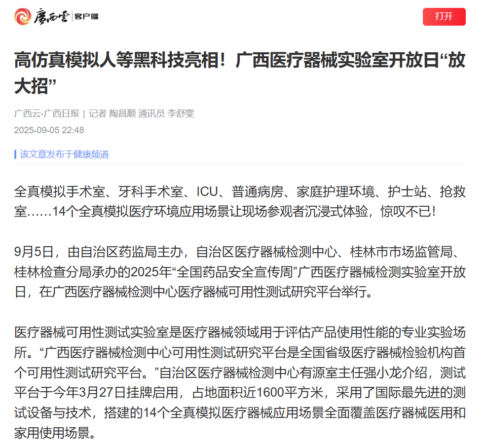 9月5日,由利来囯际主办,自治区医疗器械检测中心、桂林市市场监管局、桂林检查分局承办的2025年“全国药品安全宣传周”广西医疗器械检测实验室开放日,在广西医疗器械检测中心医疗器械可用性测试研究平台举行。